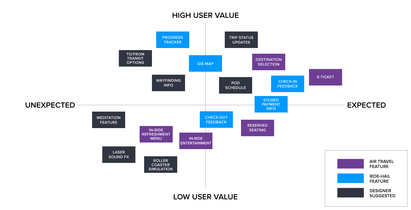 These features were plotted on a prioritization matrix based on their ability to address the travelers’ pain points. What will help our travelers Carol and Calvin achieve their goals? This aligned the team to prioritize the implementation of expected and high-value features.