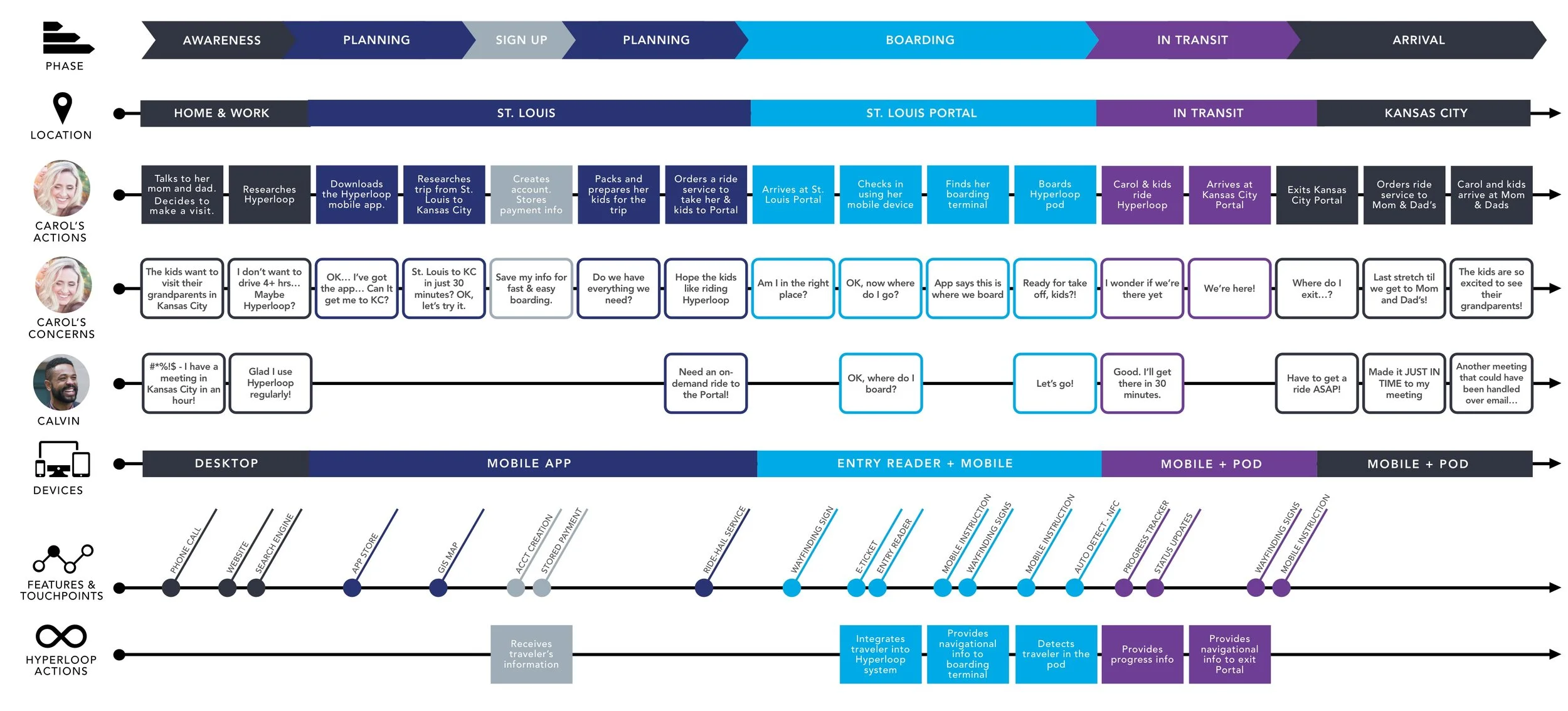 Experience map for both Carol, a first-time traveler, and Calvin, a regular commuter.